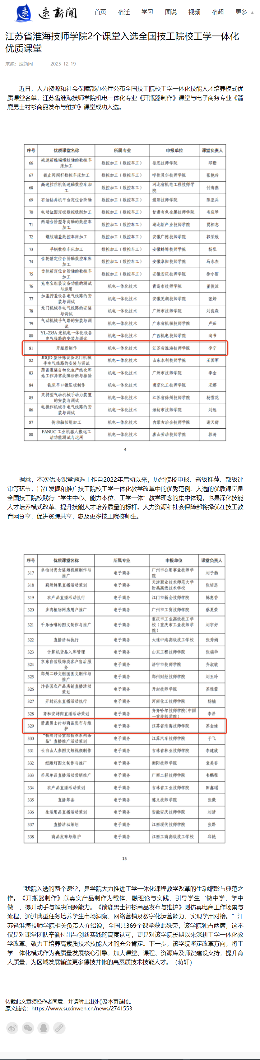 速新闻:江苏省淮海技师学院2个课堂入选全国技工院校工学一体化优质课堂