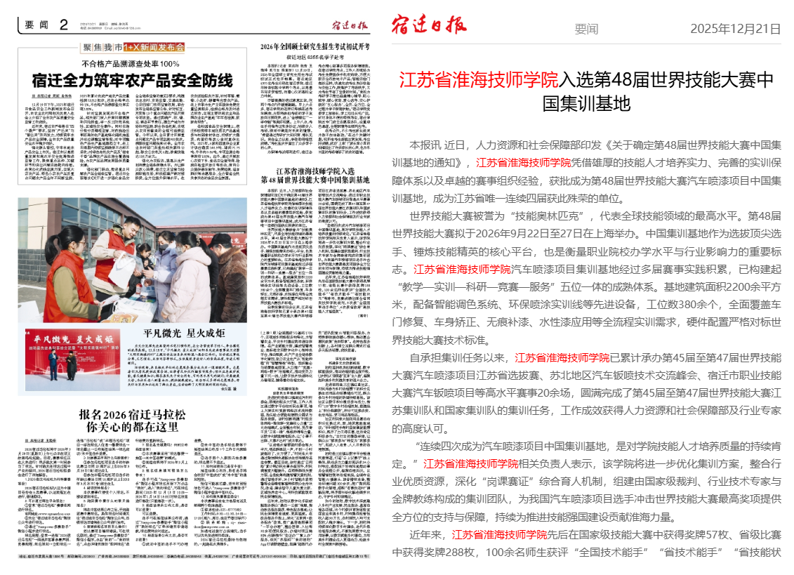 宿迁日报:江苏省淮海技师学院入选第48届世界技能大赛中国集训基地