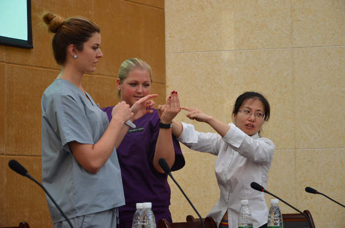 讲座过程中,来自美国的义诊专家介绍了日常生活中口腔护理的小知识,牙线及牙刷的使用技巧,专家与现场学生踊跃的互动,并一一解答了在座学生所提出的牙防问题。
