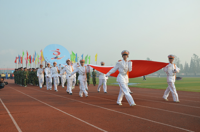 在隆隆的礼炮声中,市人社局纪检组长李军书记宣布淮海技师学院第四届运动会开幕。
