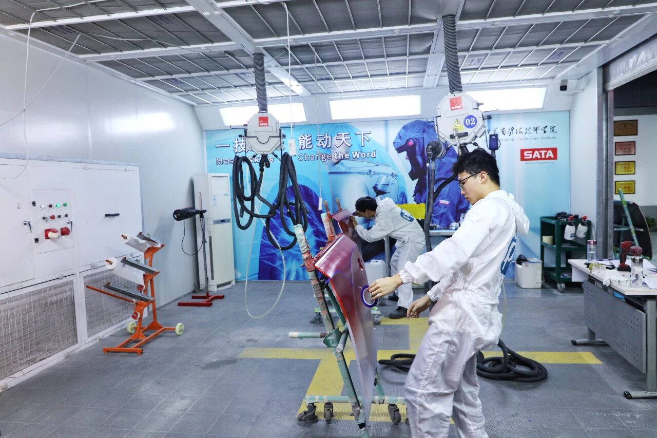世界技能大赛被誉为“技能奥林匹克”,代表全球技能领域的最高水平,第48届世界技能大赛拟于2026年9月22日至27日在上海举办。中国集训基地作为选拔顶尖选手、锤炼技能精英的核心平台,亦是衡量职业院校办学水平与行业影响力的重要标志。我院汽车喷漆项目集训基地经过多届赛事实践积累,已构建起“教学—实训—科研—竞赛—服务”五位一体的成熟体系。基地建筑面积2200余平方米,配备智能调色系统、环保喷涂实训线等先进设备,工位数380余个,全面覆盖车门修复、车身矫正、无痕补漆、水性漆应用等全流程实训需求,硬件配置严格对标世界技能大赛技术标准。