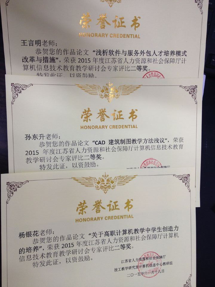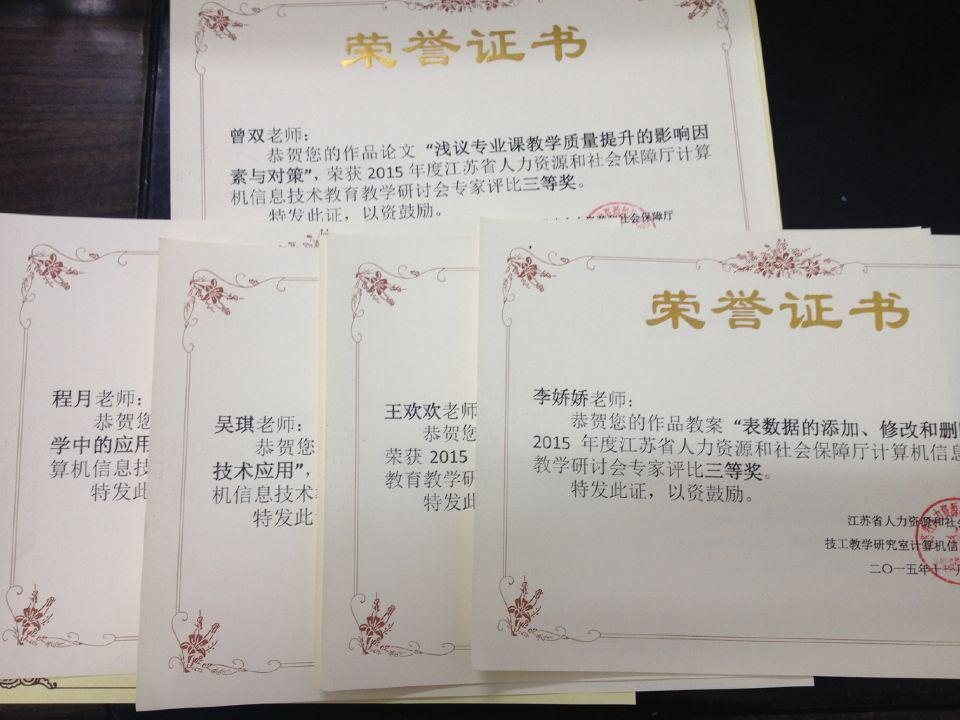近日,在2015年省技工院校计算机专业教研活动中,我院程月、臧其圣等13位老师教科研成果在评比中取得优异成绩,分别荣获省中心教研组教科研成果评比二、三等奖。