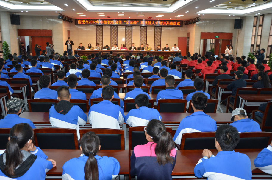 5月15日上午,宿迁市2016年中德职教合作“金蓝领”高技能人才培训开班仪式在淮海技师学院隆重举行,宿迁市委组织部副部长、市人社局局长张莉,宿迁市人才办副主任谭永恒、宿迁市财政局副局长李勇、宿迁市教育局副局长陈向阳、宿迁市人民政府外事办公室副主任崔岩、宿迁市经信委调研员张宝林、淮海技师学院副院长张兵营,德国维修电工专业教师英格•罗森布拉特、数控技术专业教师史蒂芬•鲍曼,常州雅堂德中教育投资咨询有限公司张琳女士出席本次仪式,仪式由市人社局副局长、市考试鉴定中心主任张永生主持。