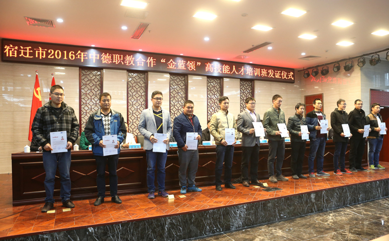 伴随着宿迁的资格资质去行政化改革的深化,我市于2015年开始正式启动与德国埃尔福特教育培训中心、德国工商业行会和德国手工业协会的合作,围绕着技能人才的培养,共开展了五个合作项目。一是实施“金蓝领”高技能人才培养;二是成立运作“中德职业技能培训鉴定中心”;三是开展中德国际合作办学;四是组织赴德师资培训;五是借鉴学习德国职业教育办学经验。“金蓝领”高技能人才培训合作是其中重中之重的内容。