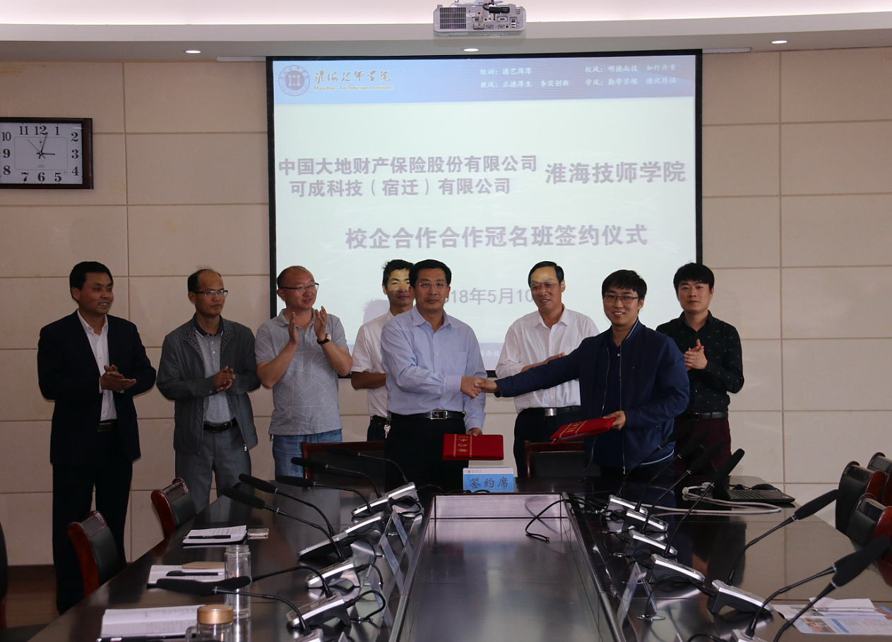 5月10日下午,我院与中国大地财产保险股份有限公司、可成科技(宿迁)有限公司举行校企合作签约仪式。学院党委副书记、副院长张兵营代表学院分别与大地保险公司总经理丁宗烽和可成科技人力资源部经理张启顺签订合作协议。学院党委委员、副院长王治,院委委员、党总支副书记胡柯及相关部门负责人参加了签约仪式。