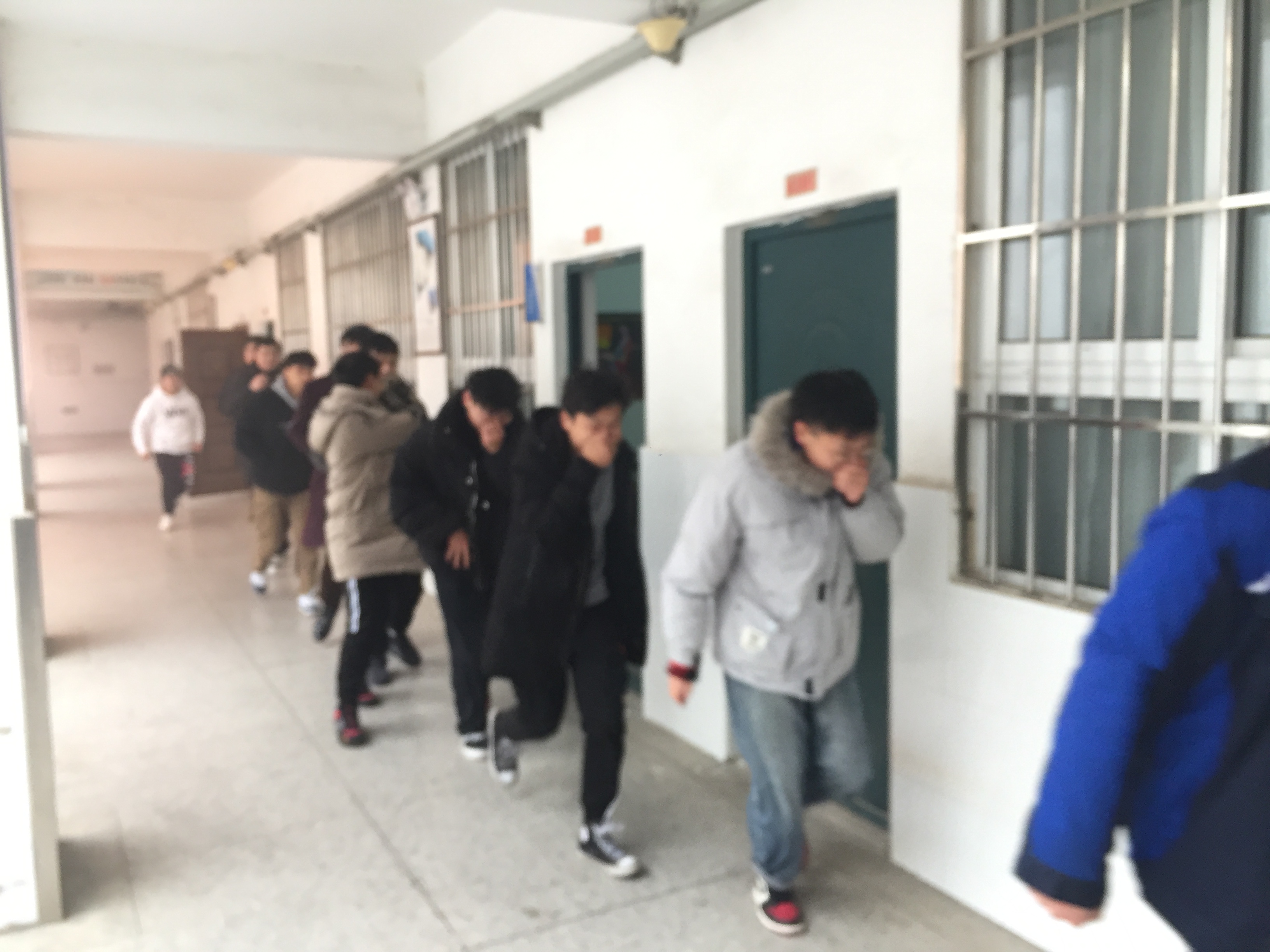 随着警报声的响起和烟雾弹不断冒起的浓烟,坐在教室的学生在教师的指导下立即捂住口鼻整齐有序地离开教学楼直奔体院馆广场。全程师生紧密配合,相互帮助,在短短的几分钟内完成紧急疏散演习活动并排列整齐地站在体育馆前。