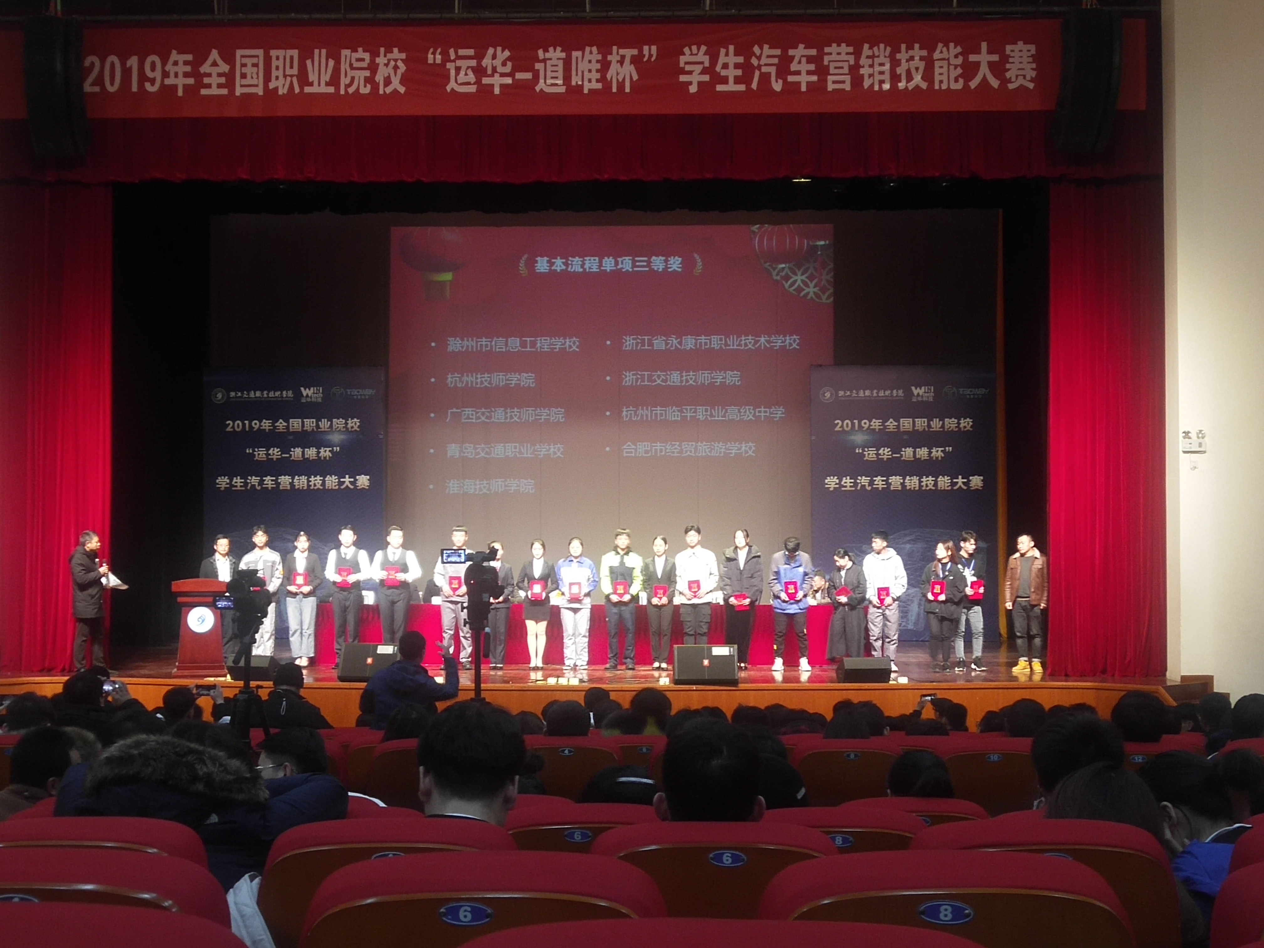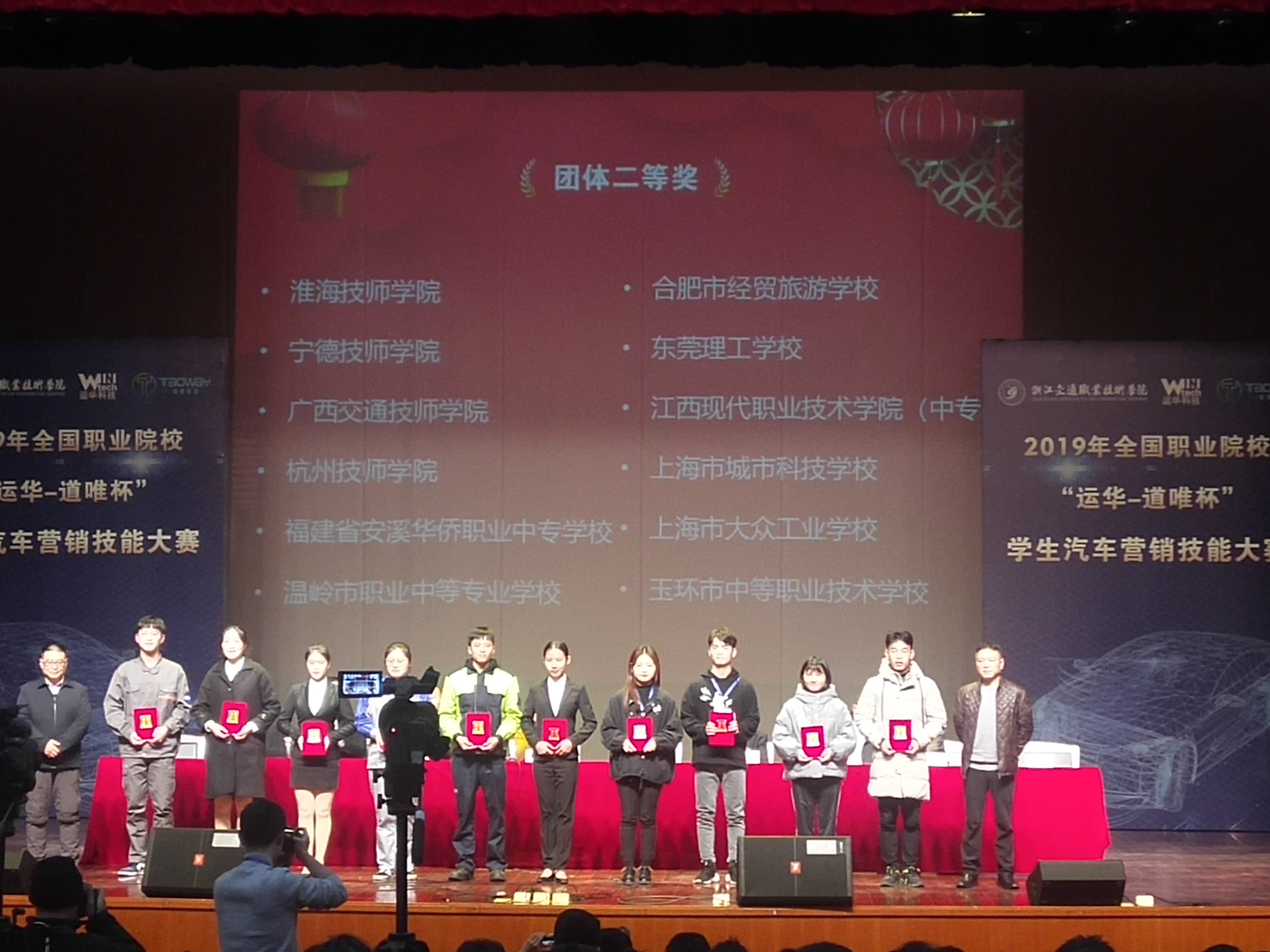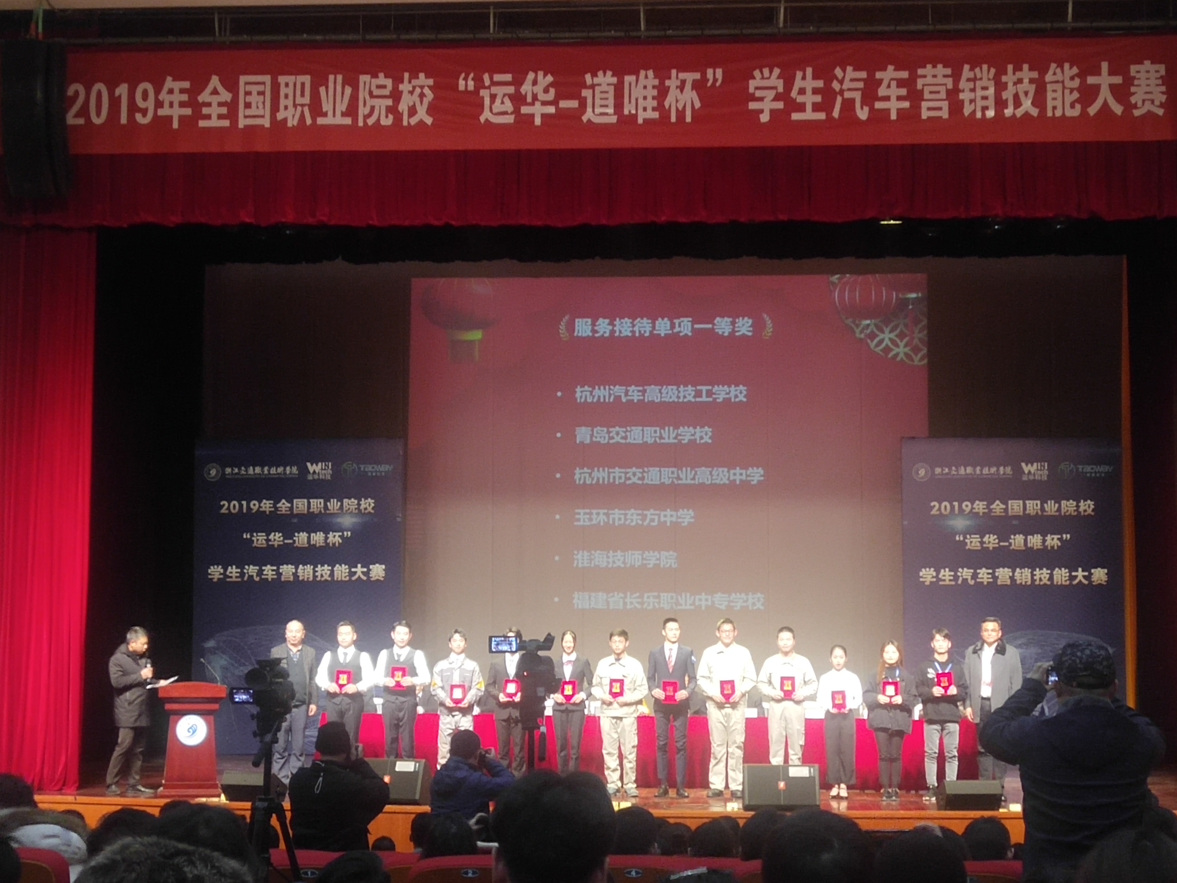 12月16日至19日,2019年中职院校“运华-道唯杯”学生汽车营销技能大赛在浙江交通职业技术学院举行,我院汽车营销项目团队在比赛中表现出色,荣获服务接待单项一等奖、团体二等奖、基本流程单项三等奖的好成绩。