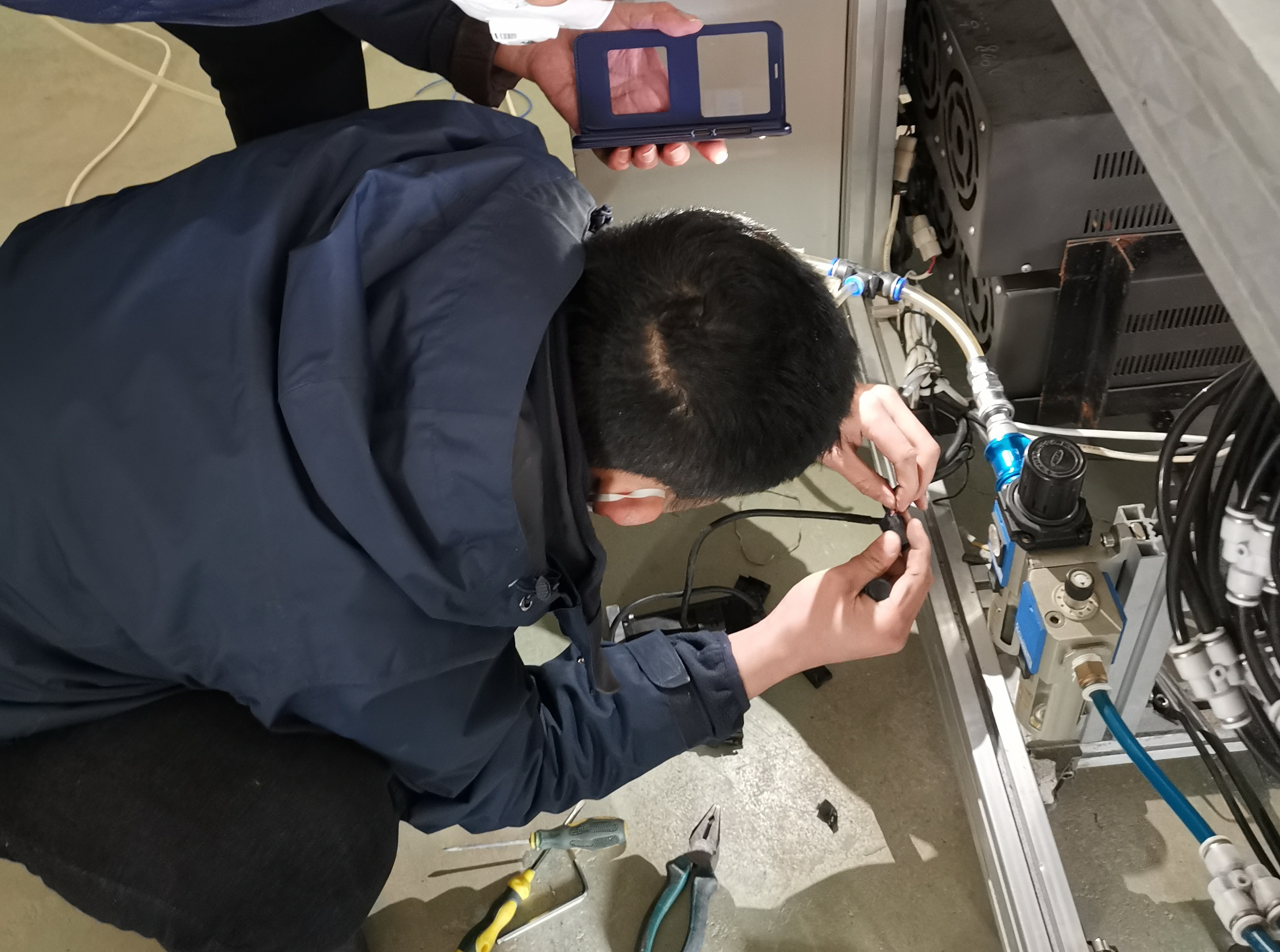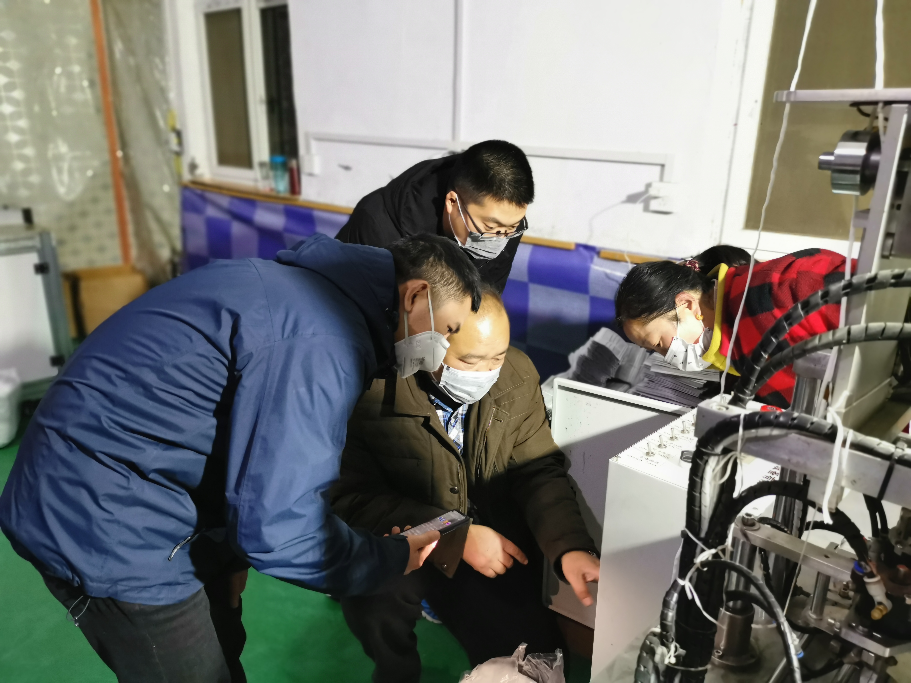 由于口罩紧缺,该公司设备全天候满负荷运行,因此在1月30日晚7点,又有2条生产线发生故障造成停产,学院在接到求助电话后,维修组教师再次连夜赶赴该公司,对设备进行排查检修,确保正常运转。为保证设备在关键时刻正常运行,学院安排维修组同志轮流现场技术指导,确保该公司在此次疫情防控中发挥更多的作用。