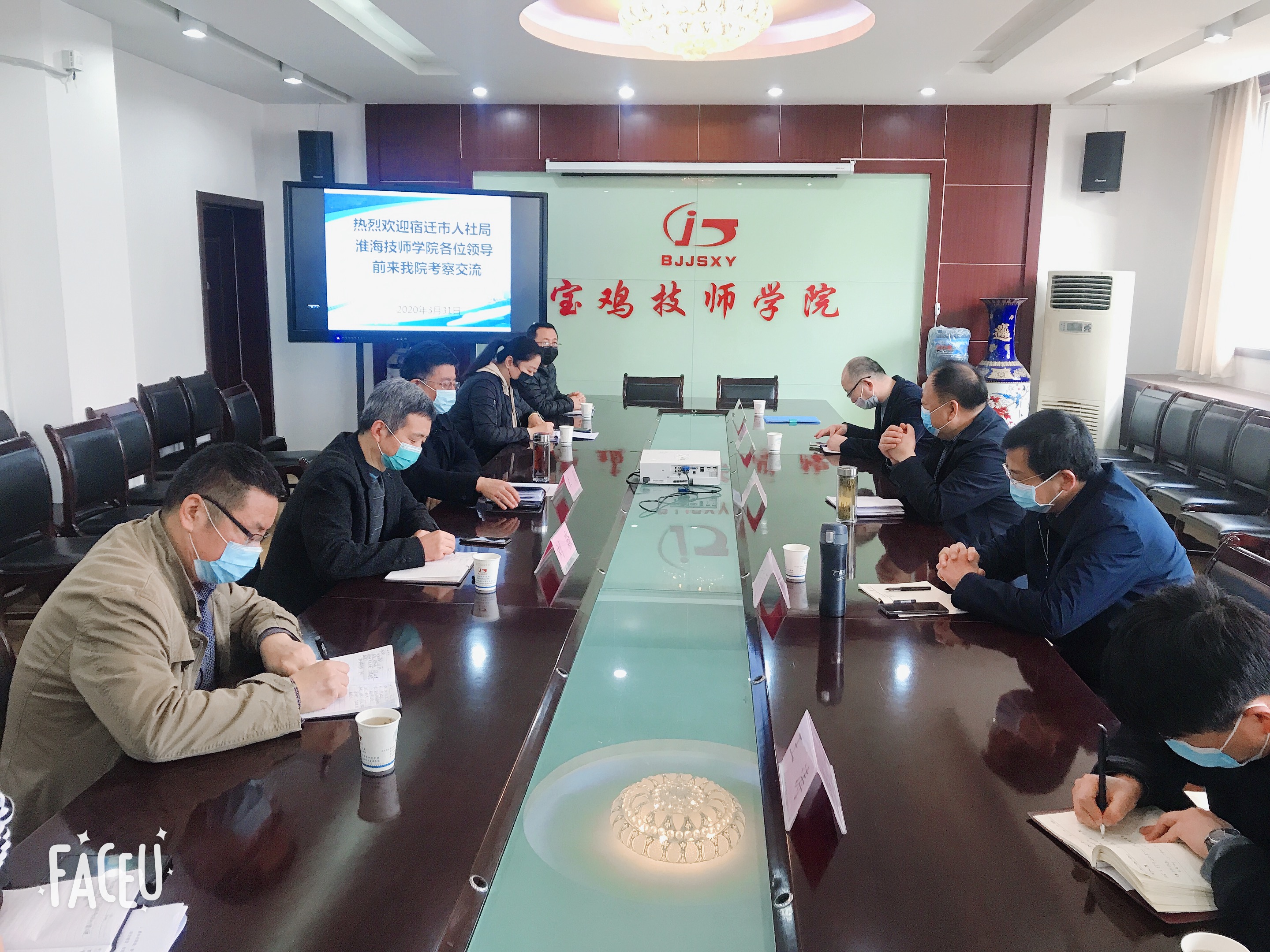 为加快推进我市实施就业优先战略,助推省外技能人才就业,精准保障我市百亿级产业企业人力资源需求,破解就业、招工二元难题,3月30日至4月3日,宿迁市人社局党组成员、市考试鉴定中心主任张永生带领我院张兵营院长及相关部门负责人一行前往陕西、甘肃等地技工院校参观交流,对接2020年(宿迁)校企合作洽谈会——“全国重点职技院校宿迁行”活动, 开展校企合作项目对接洽谈,推进中西部地区校企合作和产教融合,构建技能人才供给需求对接平台。