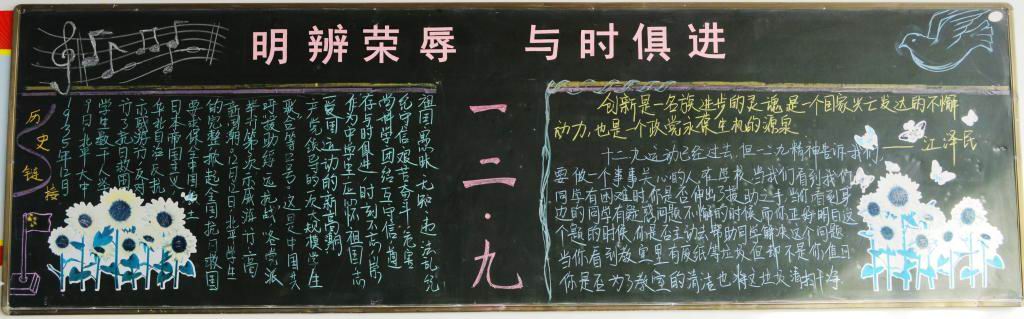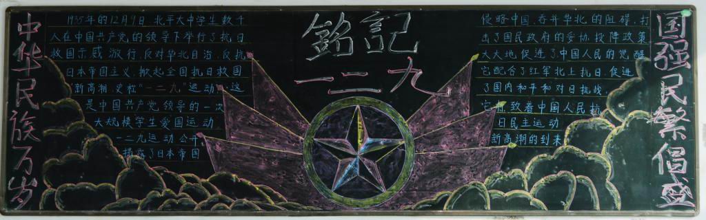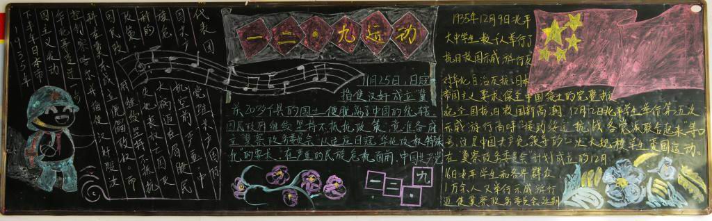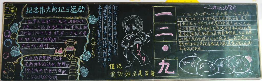 各班的黑板报版面新颖,图文并茂,具有一定的针对性和可读性。通过丰富多彩的图文形式使同学们了解到“12.9运动”是历史上一个重要的爱国运动,历史是我们不能忘记的!
