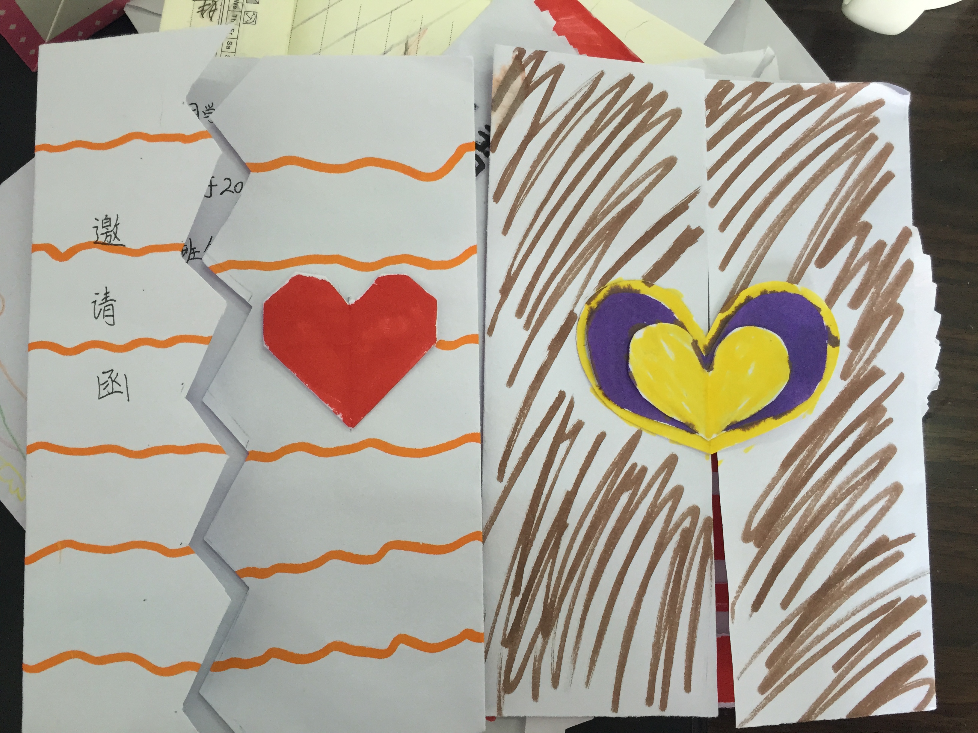 传统的请柬主要分三种形式,正方型,长方型,长条型,这些产品的外形和尺寸都有一定的比例和大小。但是同学们不拘一格、大胆创新,制作出了许多形式新颖、外观独特的个性化请柬,千纸鹤、纸船、飞机、书本、花篮、信封等等各类形式都被巧妙借鉴到大家的设计中。