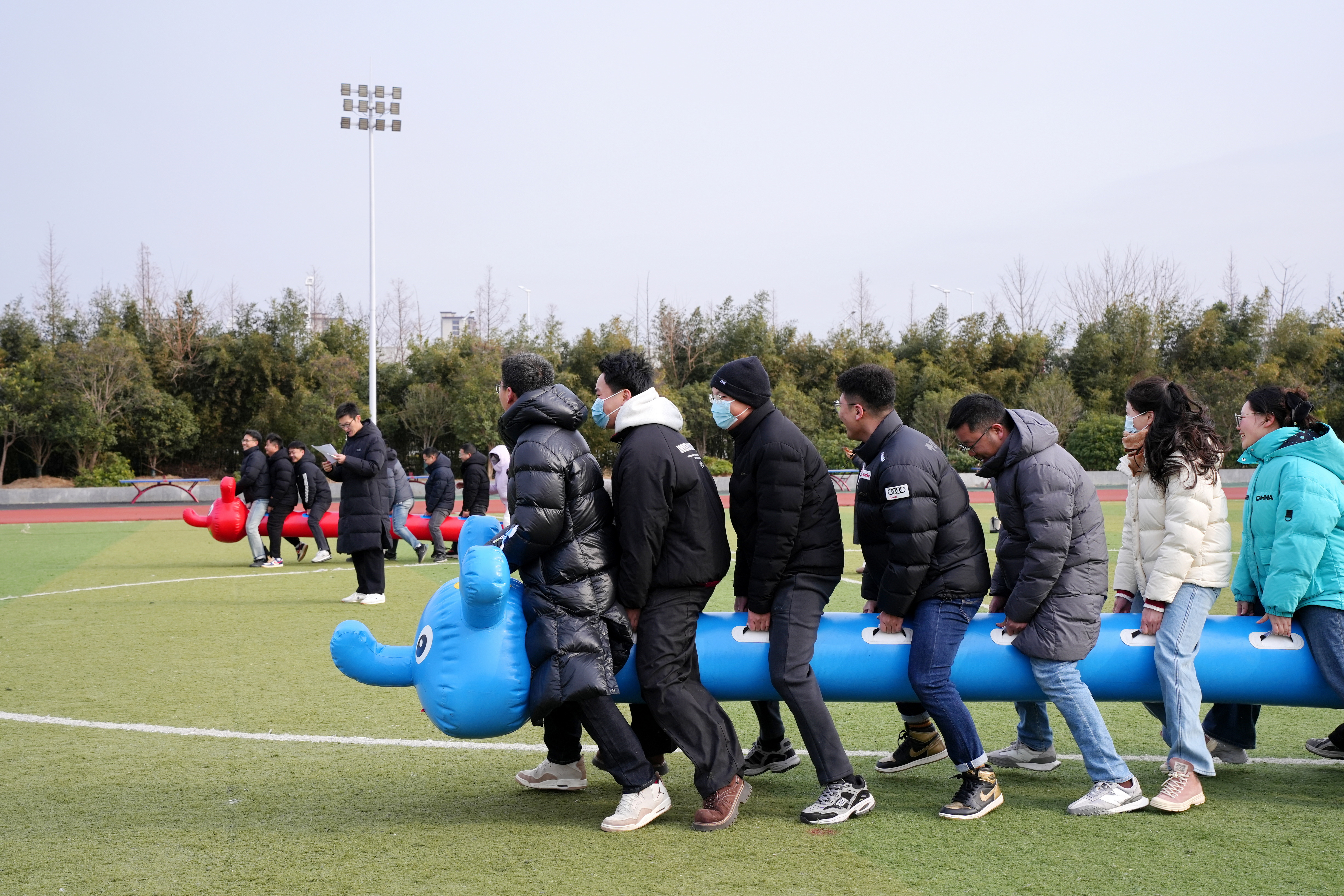 下午的职工趣味运动会同样热闹非凡。拔河队列的两侧,旁观的教师们喊声震天,抑或笑得前仰后合;“毛毛虫大战”项目,参赛选手们仿佛上演人类首次驯服双腿,即使狼狈却也不失欢乐;夹球跑项目中,教师们一个紧挨着一个,生动展示着平衡与节奏的技巧。