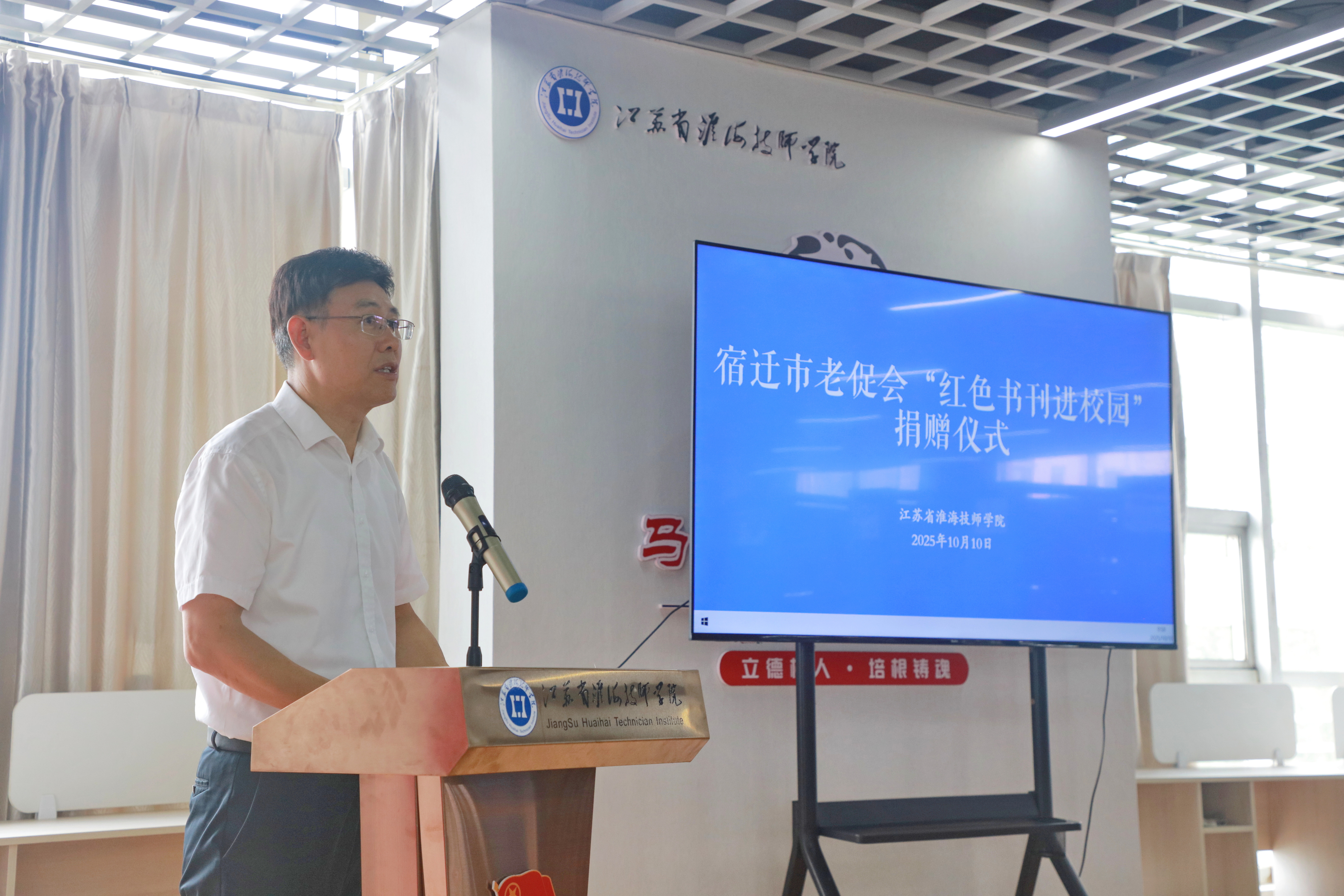 李军在致辞中代表学院对市老促会表示衷心感谢。他指出,作为培养高素质技术技能人才的摇篮,学院始终把为党育人、为国育才作为根本使命,而红色文化正是我们培育时代新人的“精神沃土”。这批红色书刊承载着宿迁革命老区的厚重记忆与深刻内涵,为学院的红色教育注入了新的宝贵养分。