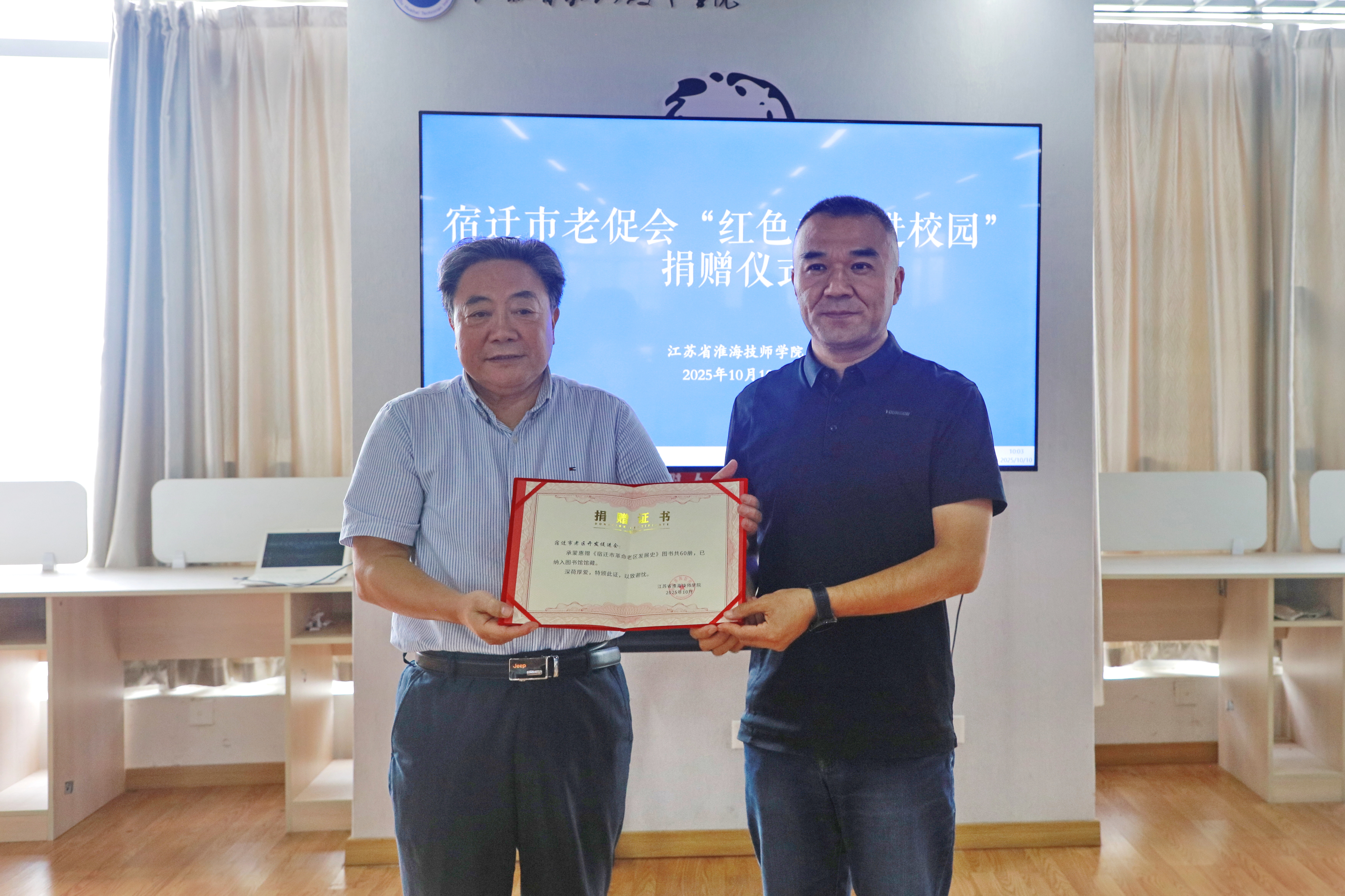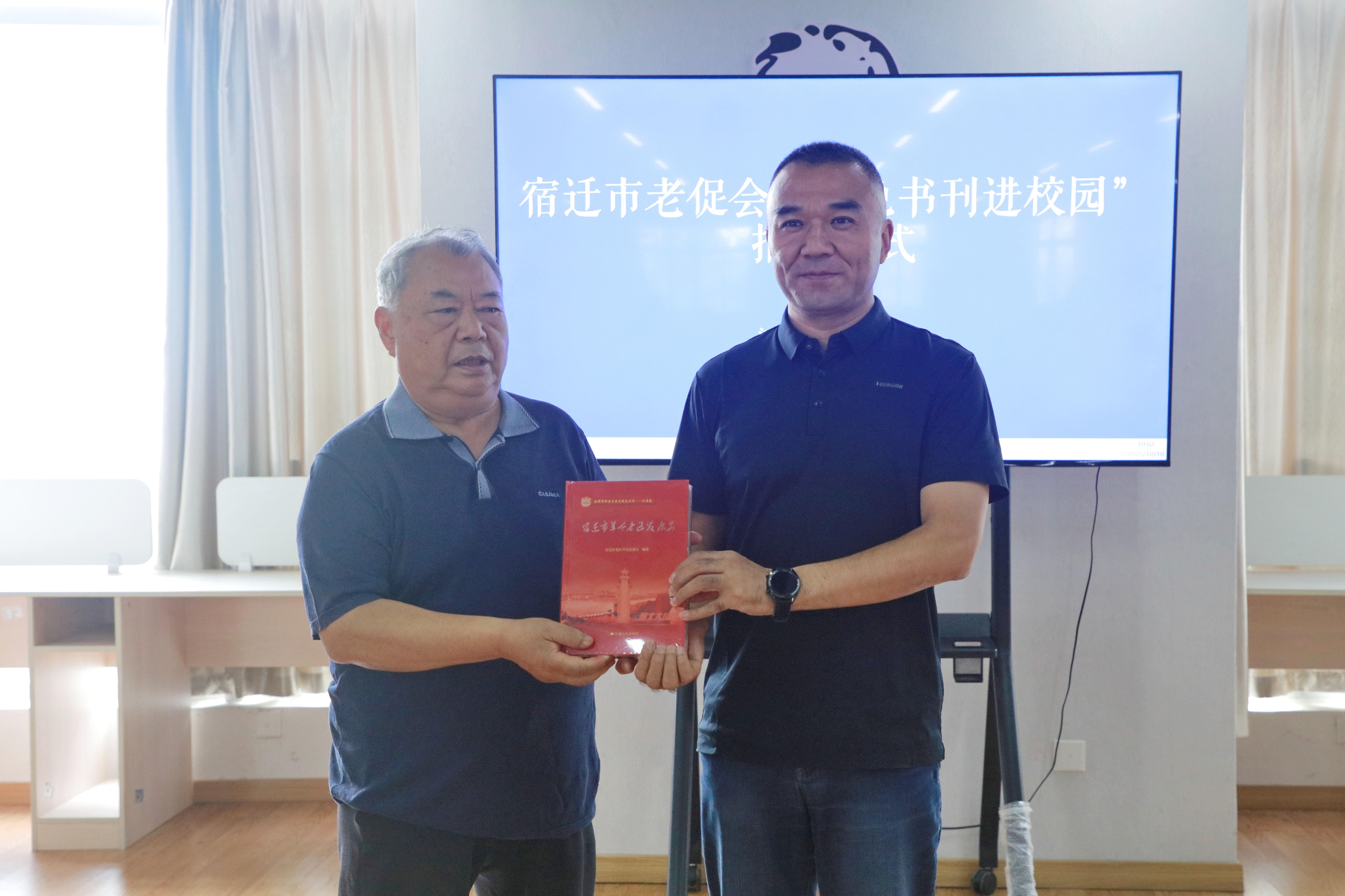 赠书环节,朱宇亮代表学院接收赠书并回赠《捐赠证书》,以表达诚挚谢意。市老促会此次向学院捐赠了包括《宿迁市革命老区发展史》《全国革命老区发展史(宿迁卷)》《中国老区建设》《铁军》等红色书刊和杂志等共计60余册。