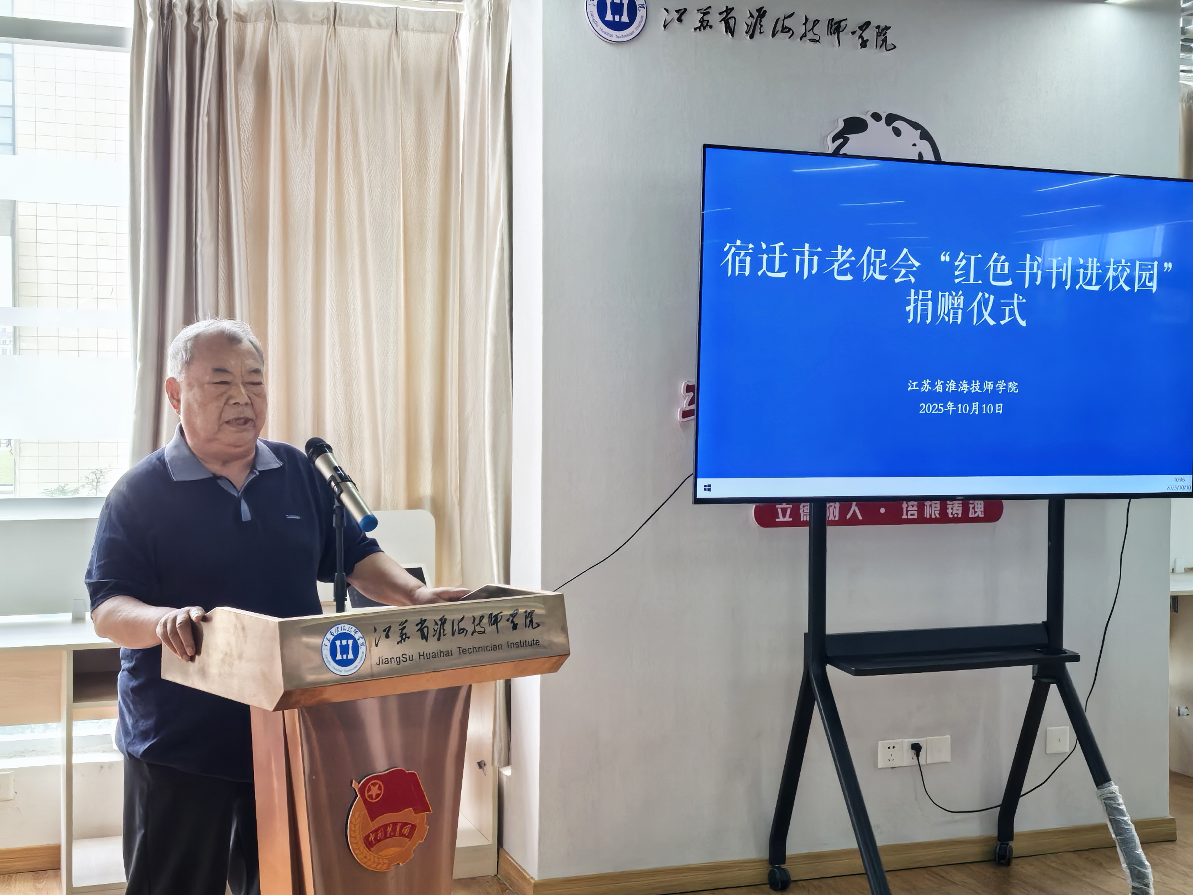 10月10日,宿迁市老区开发促进会(以下简称“市老促会”)理事长潘玉利一行走进我院,举行红色书刊“进校园”捐赠活动,为师生们带来了丰厚的“精神食粮”。学院党委书记李军、院长朱宇亮出席活动,相关部门负责人及师生代表共同参与,副院长王坤主持活动。